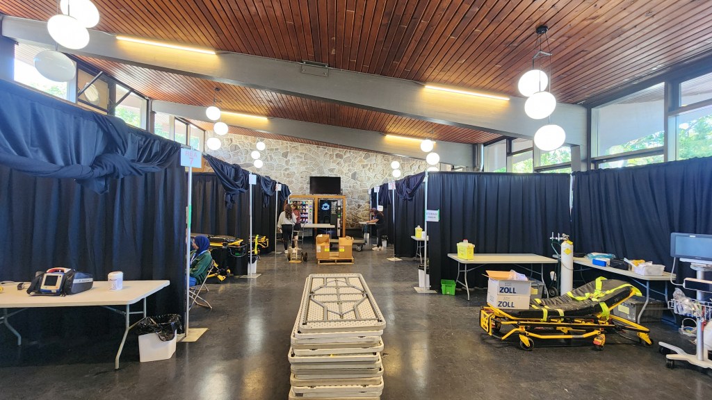 Hôpital de fortune sur le site d’arrivée du Marathon Beneva de Montréal.
