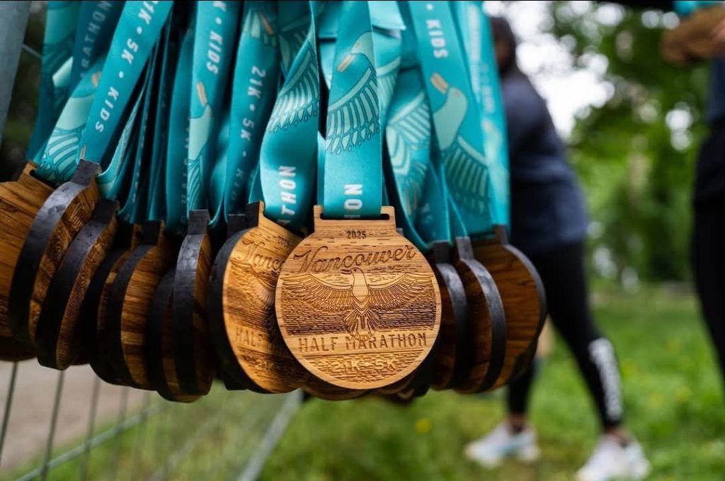 Médailles en baguette de bois usagées confectionnées dans le cadre du Marathon de Vancouver.